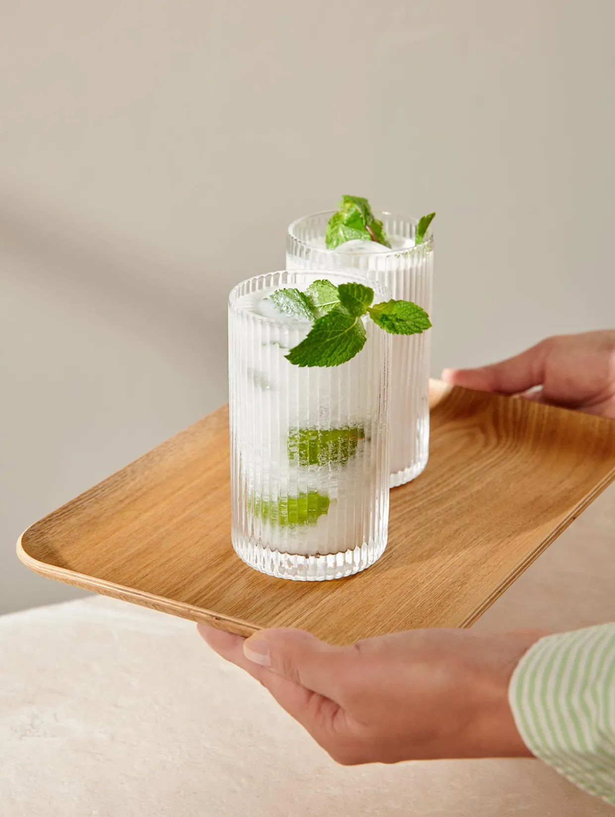 Tumbler mit gerilltem Oberflächendesign aus der Kollektion Juna. Das mundgeblasene Trinkglas ist langlebig und spülmaschinengeeignet.