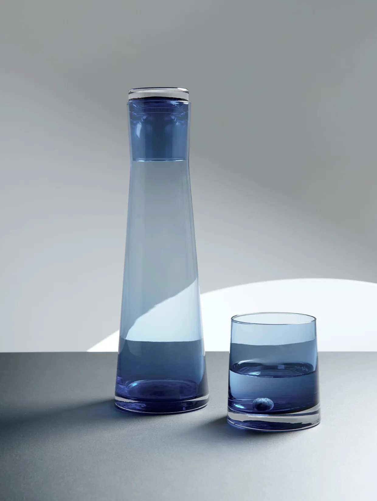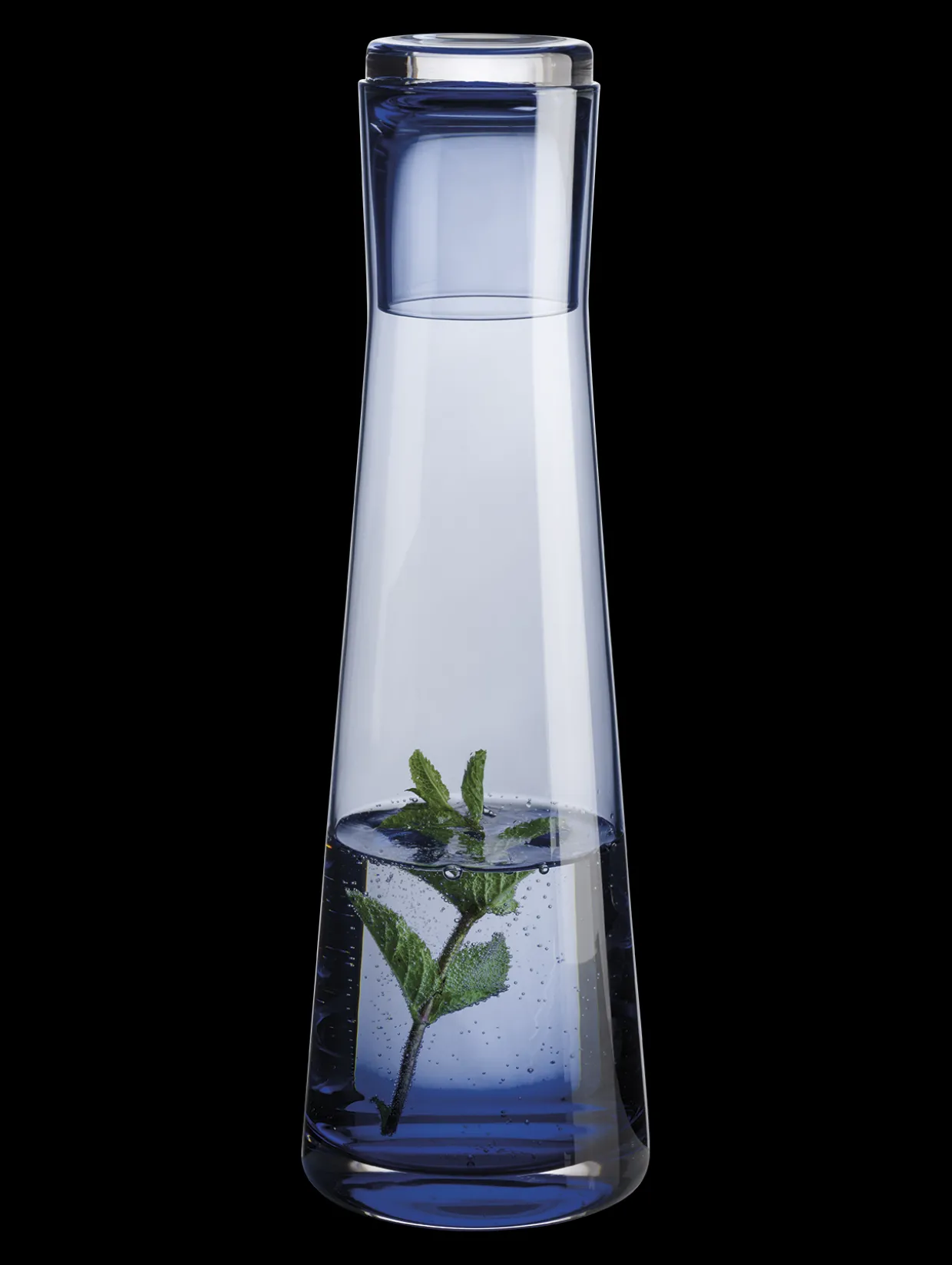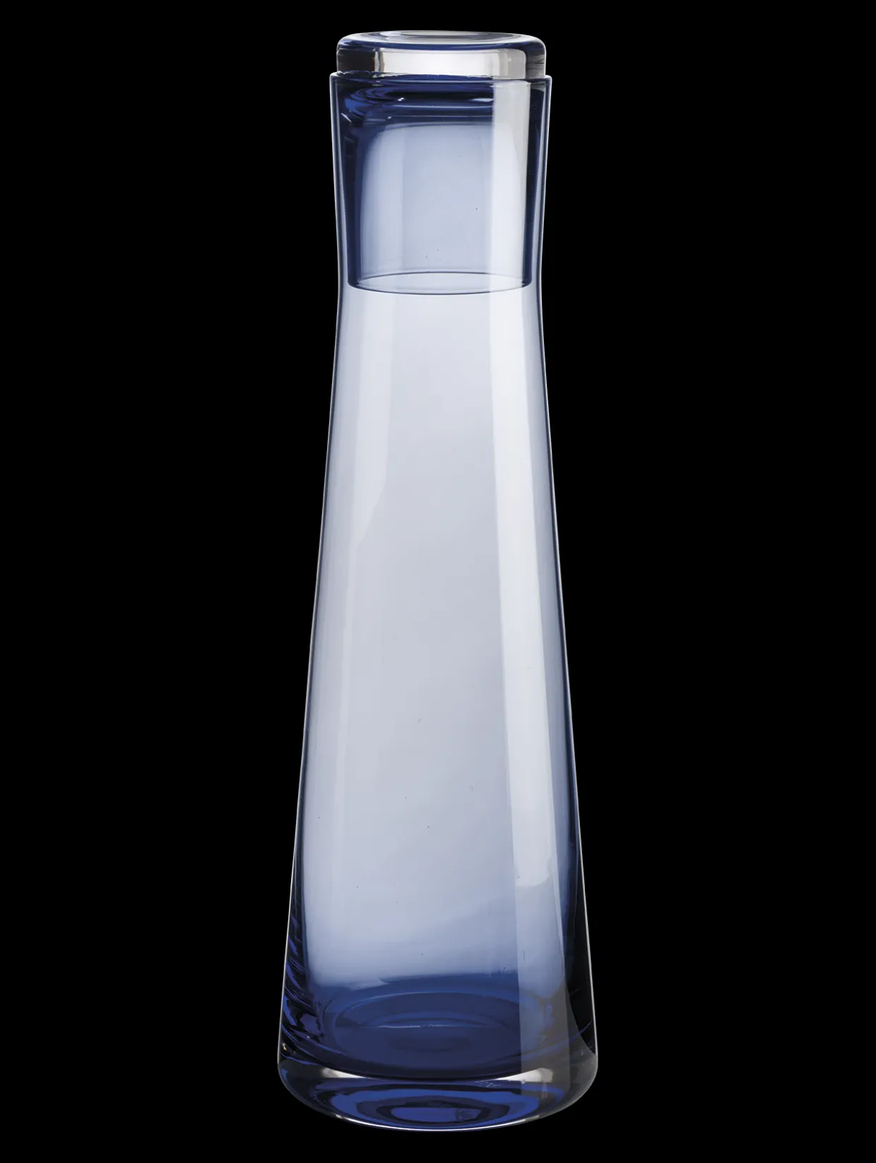 Karaffe für 700 ml Inhalt aus durchgefärbtem Glas in der Farbe „blue sky“. Die schlanke, hohe Karaffe verfügt über einen dicken Glasboden, der für zuverlässige Standfestigkeit sorgt. Ein besonderes Merkmal ist der Stopfen. Dieser ist so konzipiert, dass er mit dem Karaffen Hals zu verschmelzen scheint.